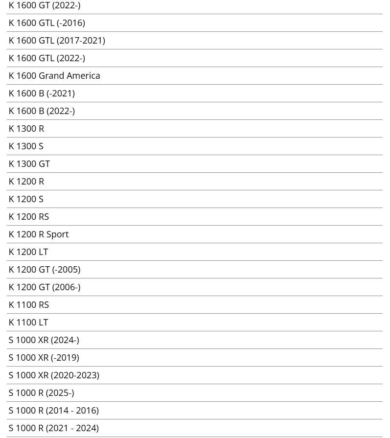 K 1200 S, K 1300 R, K 1300 GT, K 1300 R 1300 S, K 1600 B, K 1600 GT, K 1600 GT, K 1600 GT, K 1600 GT, K 1600 GTL,