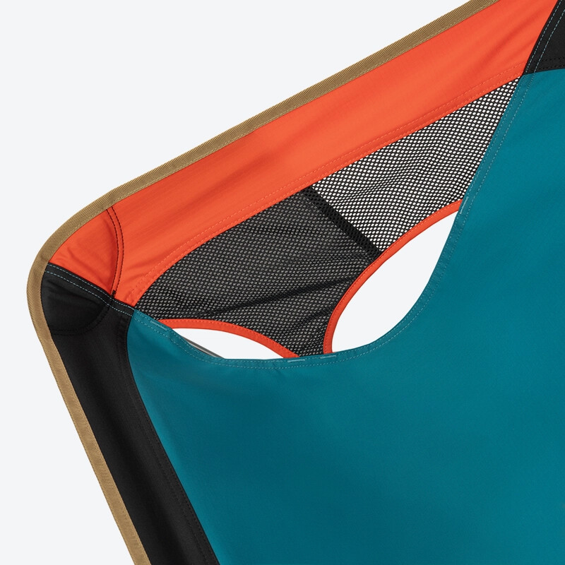 : 헤리티지 멀티 블록은 블랙·틸·오렌지 컬러와 메쉬 소재를 조화롭게 구성해 안정감과 경쾌함, 기능성을 동시에 담아냈습니다.