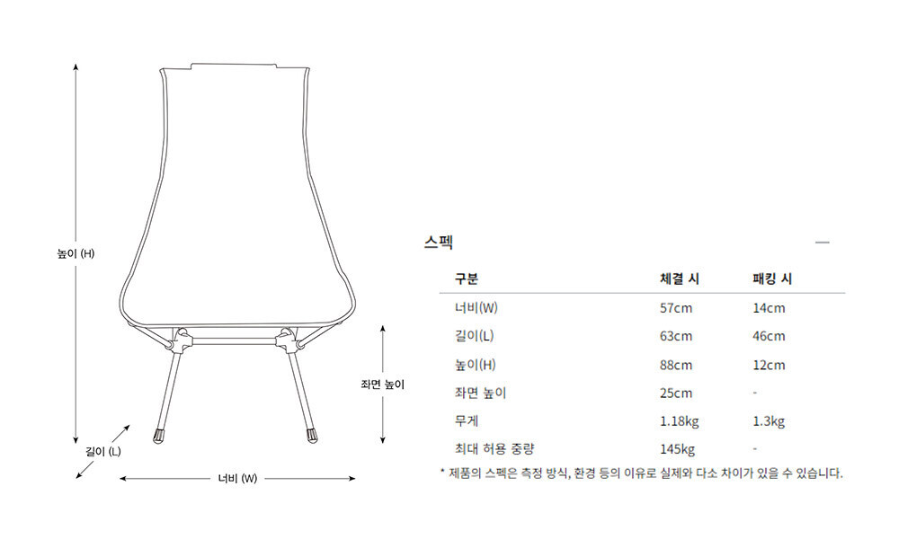 : 프레임을 컴팩트하게 접을 수 있고, 두 줄 지퍼를 적용하여 편의성을 높인 46 x 14 x 12cm 사이즈의 케이스에 넣을 수 있습니다. 패킹 시 무게는 1.3kg이지만, 내하중은 145kg입니다.